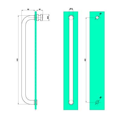 Stangen er Ø19 mm i diameter, og er 400 mm fra centrum til centrum af hul i glasset.
