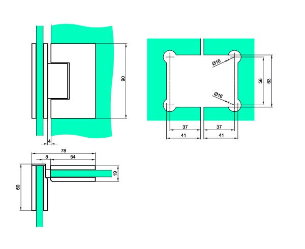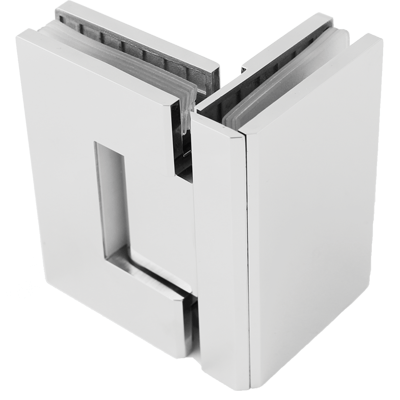 Hængsel til brusedør i glas, påmonteres på to glasvæg i en 90° vinkel. Med lukkefunktion.