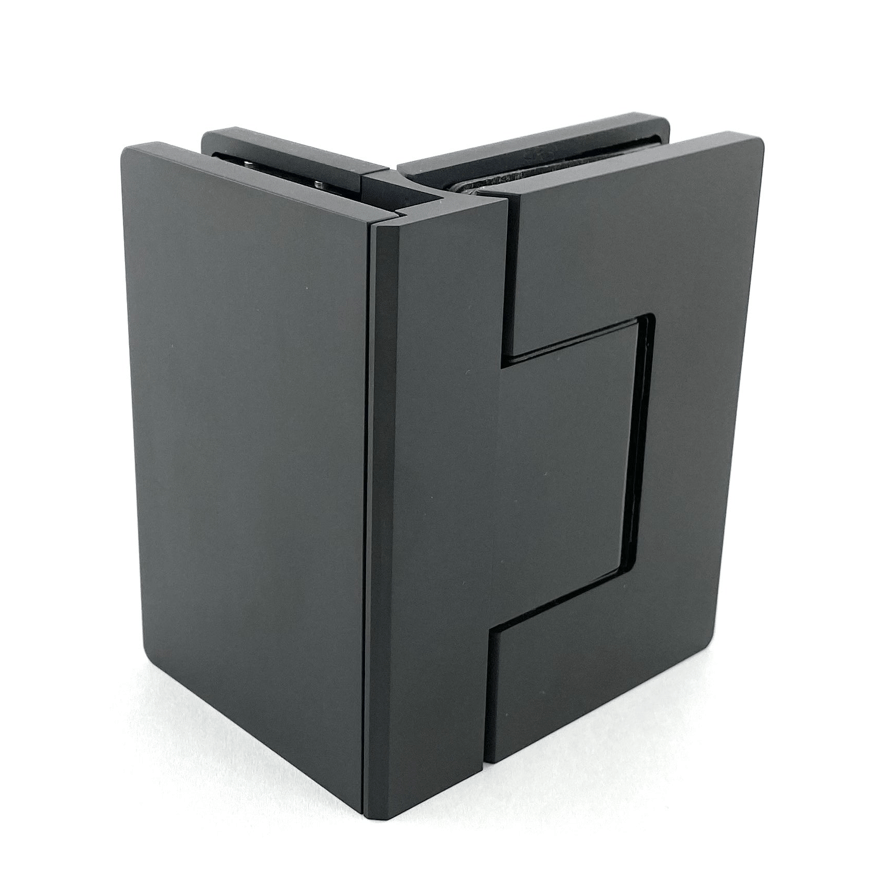 Sort hængsel til brusedør i glas, påmonteres på to glassider i en 90° vinkel.