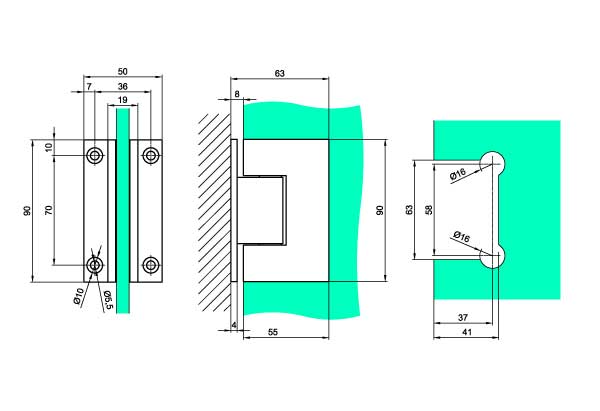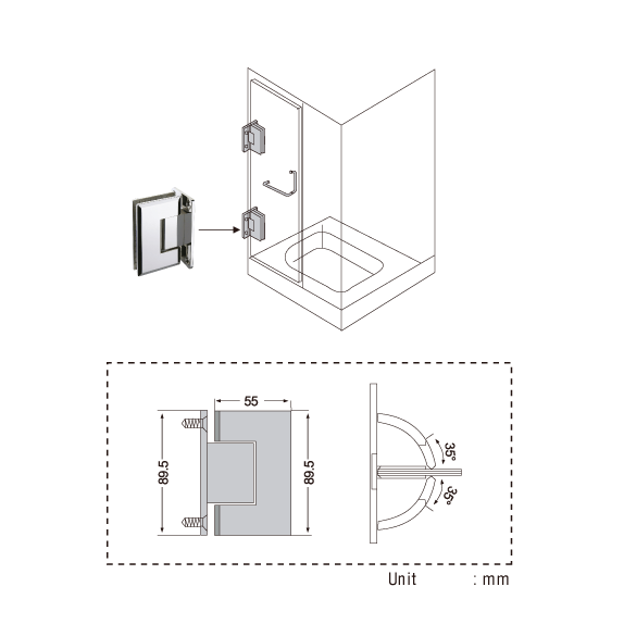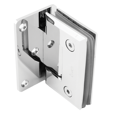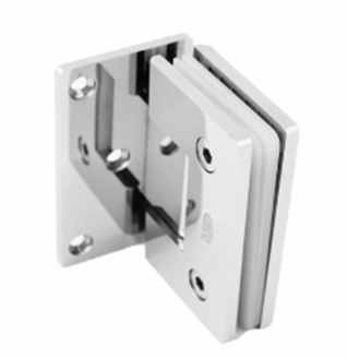 Hængsel til brusedør i glas, påmonteres på væg i en 90° vinkel.