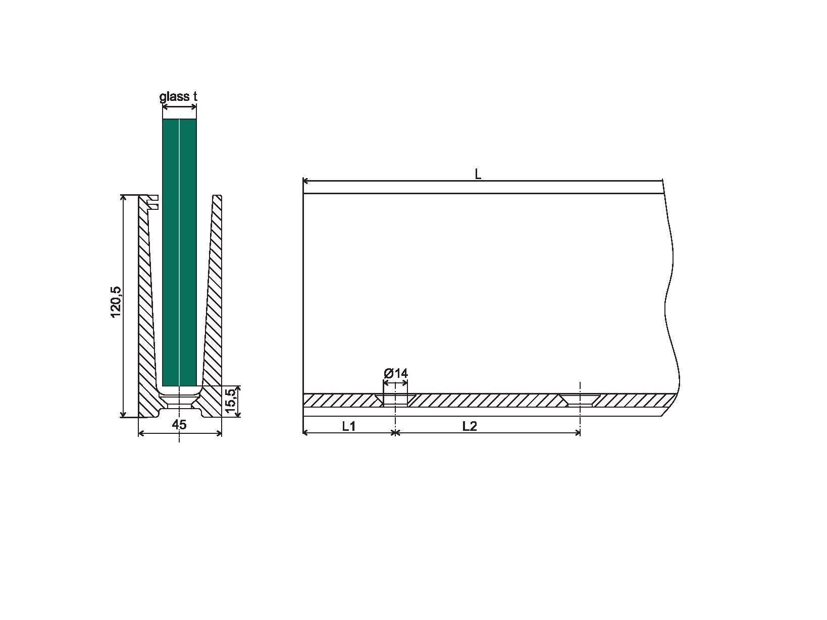 Material: Aluminium, Surface finish: Satin-ELO, Glass t: 12,00-21,52, L: 5000, Anchoring: Top, Efekt: INOX, G/h kN: 1, L1: 100, L2: 200, Length: 1,25 m